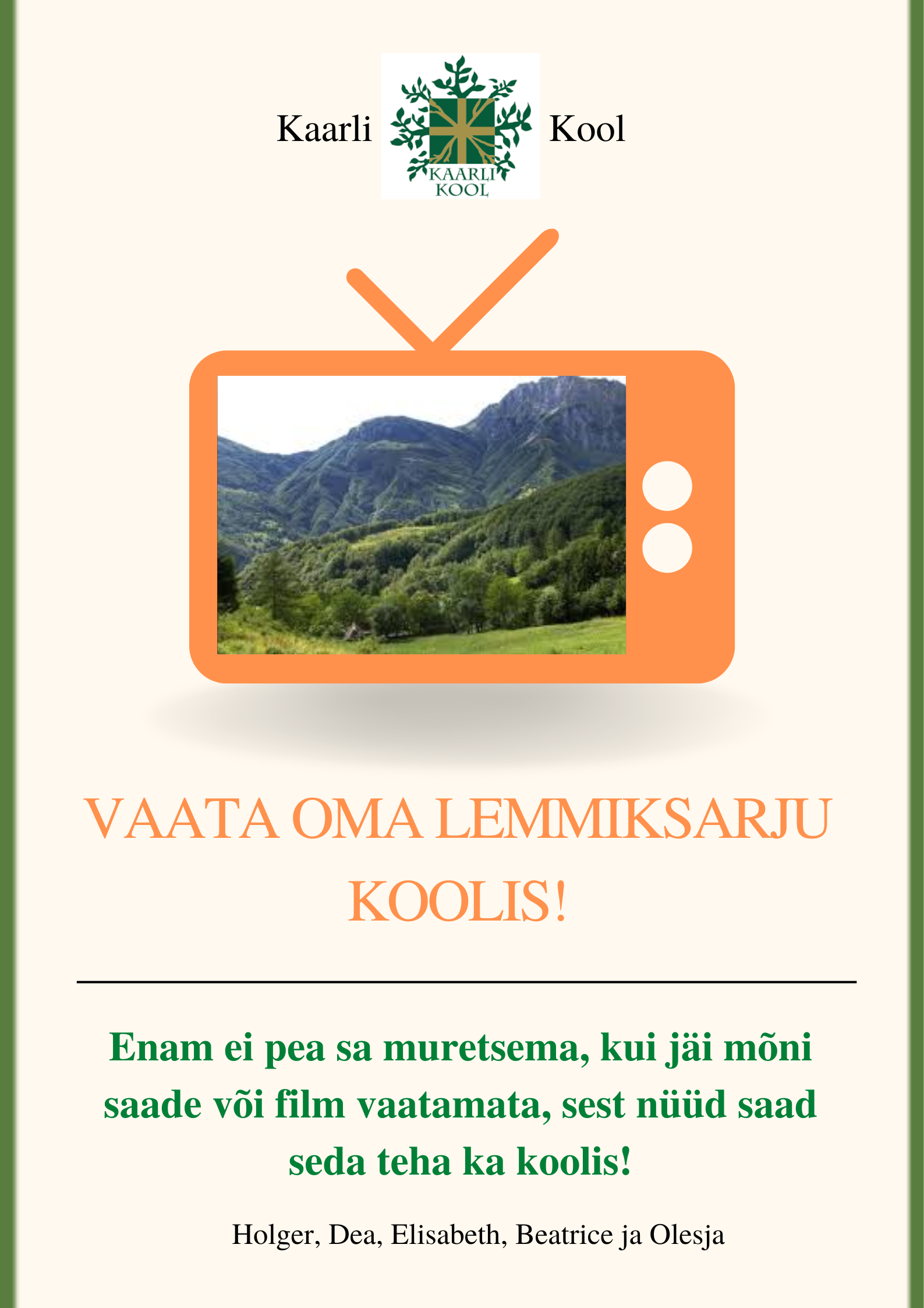 Toome 2 telekat kolmandale korrusel. Saad vaadata kõiki telesarju ja Go3. Telekad muudavad koolielu põnevamaks