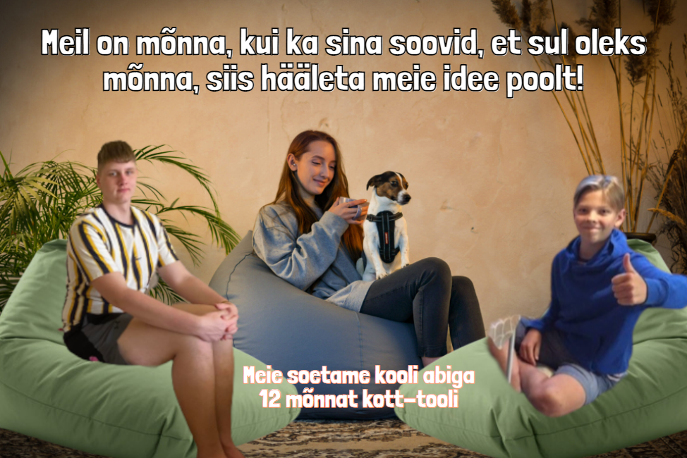 Meie soetame kaasava eelarvega koolile kaksteist uut kott-tooli, et Te saaks vaba aja veeta mugavalt ning ei peaks muretsema istumiskohtade pärast!