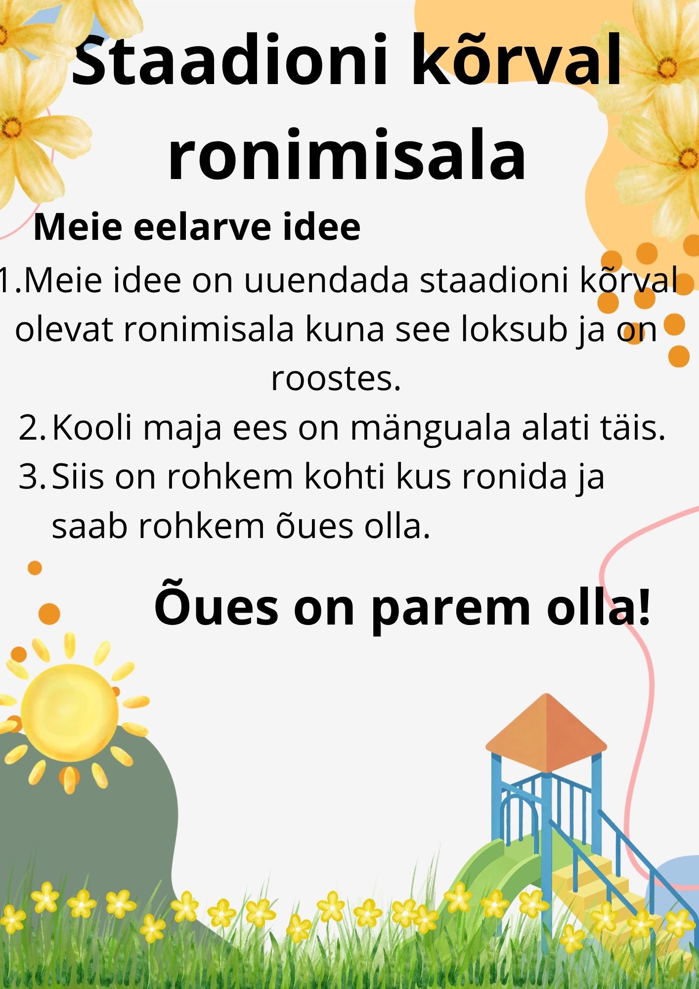 1. Meie idee on uuendada staadioni kõrval olevat ronimisala, kuna see loksub ja on roostes.